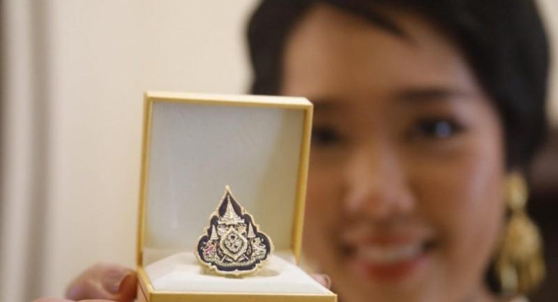Made of tin and copper, this pin is 3.8 centimetres long, with a blue and golden rim background. King Rama X’s initials appear in white enamel. On the left is a mauve-coloured mythical half-lion, half-elephant carrying a seven-tiered umbrella while on the right sits a white lion carrying a similar umbrella. The message “Royal Coronation Ceremony of BE2562” is inscribed in gold on green enamel. A similar message appears on the back of the pin. Its lock is made of gold-coated brass. This pin is sold in a box made of 120-gram gold-leaf art paper with a plastic cover. The ivory-coloured box is 6.4cm x 6.8 x 2.8 with a lid carrying the golden emblem of the Royal Coronation ceremony.