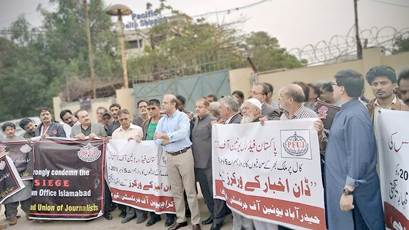 Participants in Karachi carried banners from the Karachi Union of Journalists, Hyderabad Union of Journalists and Sukkur Union of Journalists condemning the siege and pledging solidarity with Dawn.