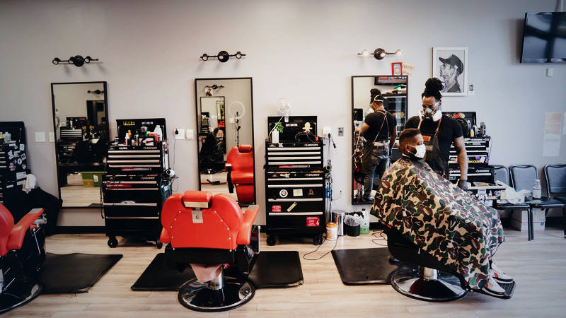 Quaadir Larke, wearing a mask and surgical gloves, a pair of hospital-grade disinfectant wipes at his feet, trimmed a single customer's hair at the Quad Barber Shop in Mableton.