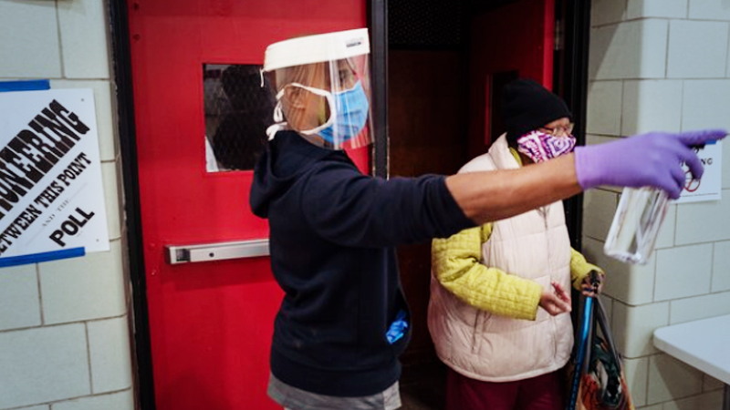 At the in-person voting sites, the pandemic's influence was unmistakable. Signs imploring people to keep their distance abounded. As voters entered the room, a volunteer sprayed their hands with hand sanitizer.