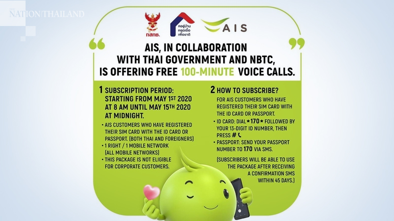 Thai subscribers can apply for the free 100 minutes of calls from May 1 to 15 by dialling *170*, followed by their identity card number, then pressing #. The free minutes kick in as soon as an SMS is received for confirmation and are valid for 45 days.