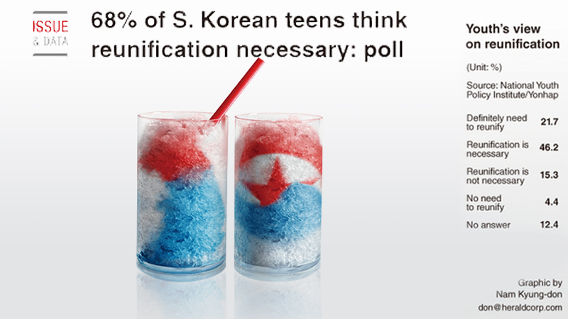 According to the poll conducted by the National Youth Policy Institute, 67.8 percent of 3,228 elementary, middle and high school students replied that the two Koreas need to reunify.