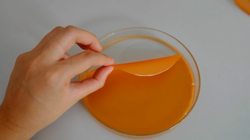 “We tested different fruits and vegetables with a high content of pectin, cellulose and starch – such as purple cabbage, tomato and mango – by heating and grinding them into a puree, then pressing it into a film,” added Sermsuk. “Carrot, at 30 per cent concentration, yielded the best results for elasticity and strength. We also added other edible substances to increase the wrapper’s durability, including 3 per cent of alginate and 3.75 per cent of xylitol.”
