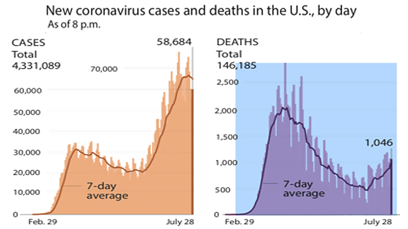 At least 4,315,000 coronavirus cases have been reported in the United States, with more than 54,000 added to the tally on Monday. More than 1,000 new fatalities were recorded Monday, raising the U.S. death toll to more than 145,000.