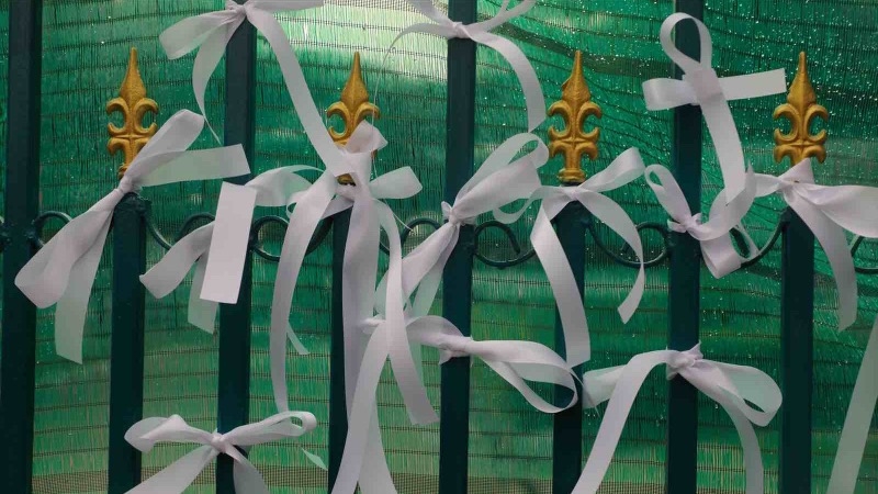 Anti-government protesters led by the Student Union of Thailand adorned the gate of Bangkok Special Prison on Saturday (September 5) with white ribbons to express their support for detained human rights activists, Arnon Nampa and Phanuphong Jadnok.