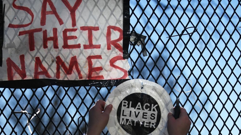 Colorful ribbons tied to the fence to form the words "we keep us safe" and "defend Black lives" would stay. So, too, would streamers on which activists had written the names of Black people killed by police. Items deemed too difficult to preserve in their current form - a circle of streamers, dried flower petals taped individually to the fence - were also left behind.