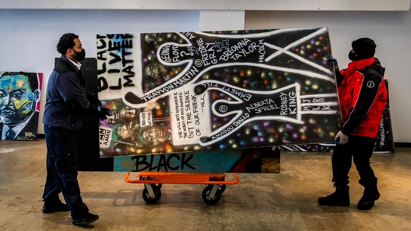 After more than six months of acting as shields over windows in and around Black Lives Matter Plaza, the plywood pieces were transported Thursday to a vacant storefront - formerly the site of an Aveda Institute training facility near a downtown Metro station. The works will serve as a centerpiece for an unfolding gallery space created by a unique partnership between a real estate giant and community nonprofit that officials hope will revitalize a commercial district decimated by the still-raging coronavirus pandemic.