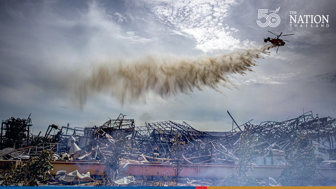 A helicopter from the Department of Disaster Prevention and Mitigation sprays the premises of Ming Dih Chemical factory in Samut Prakan’s Bang Phli district with firefighting foam on Tuesday to ensure every last smouldering ember of the chemical inferno is extinguished.