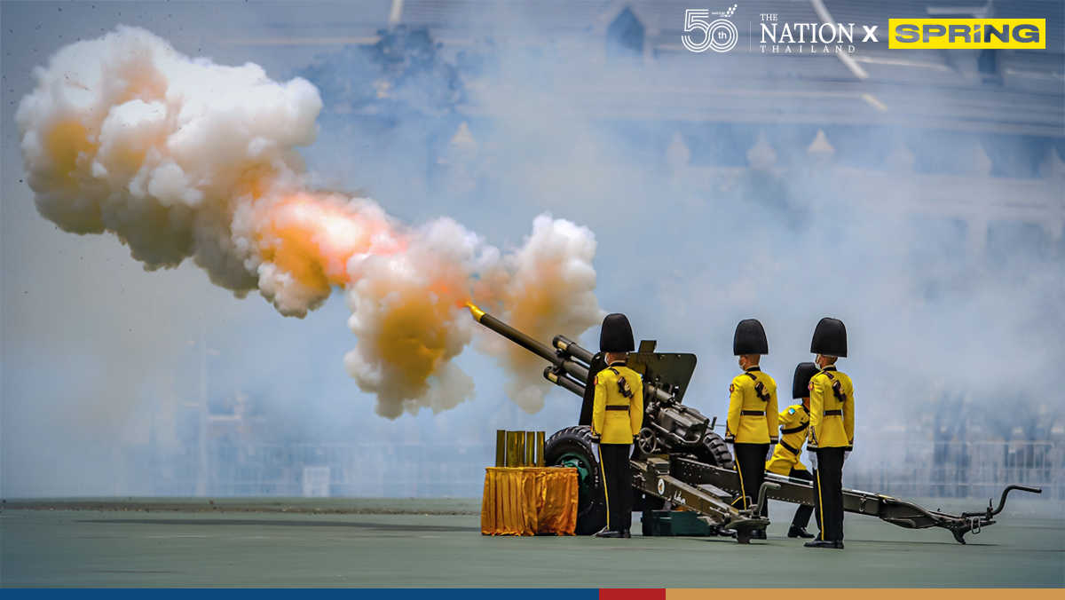 The King’s Guard launches a 21-cannon salute in honour of His Majesty the King on the royal grounds (Sanam Luang) at noon on Wednesday.