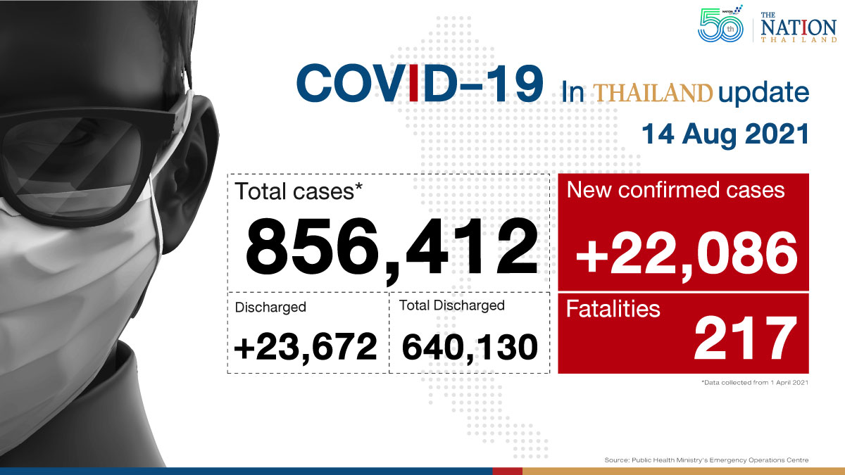 Thailand recorded 22,086 Covid-19 cases and 217 deaths on Saturday.