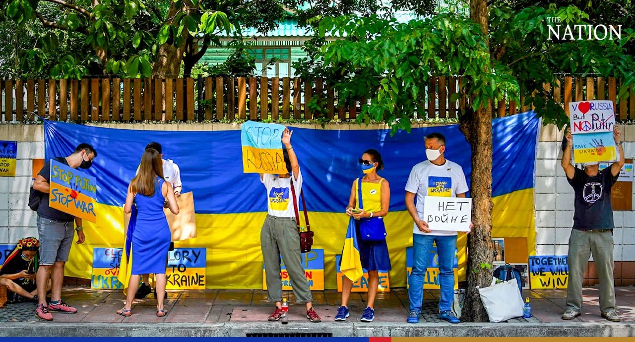 The protest came as Russian Ambassador Evgeny Tomikhin held a press conference at the embassy on the situation between Russia and Ukraine and the relationship between Moscow and Bangkok.