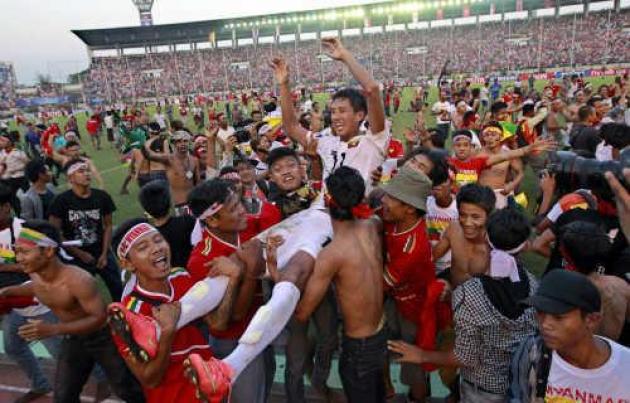 After a goalless first half the game turned into a nerve-wracking affair for the 30,000 fans at a packed into Thuwanna Stadium in Yangon. Then seven minutes after the break Myanmar’s Than Paing hit the back of the net and the stadium erupted. The fans then endured 40 minutes of heart-stopping action as Myanmar’s defence came under mounting pressure, before the final whistle transformed their agony into joy.