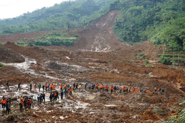 Landslides triggered by heavy rains and floods are common in tropical Indonesia during the rainy season.