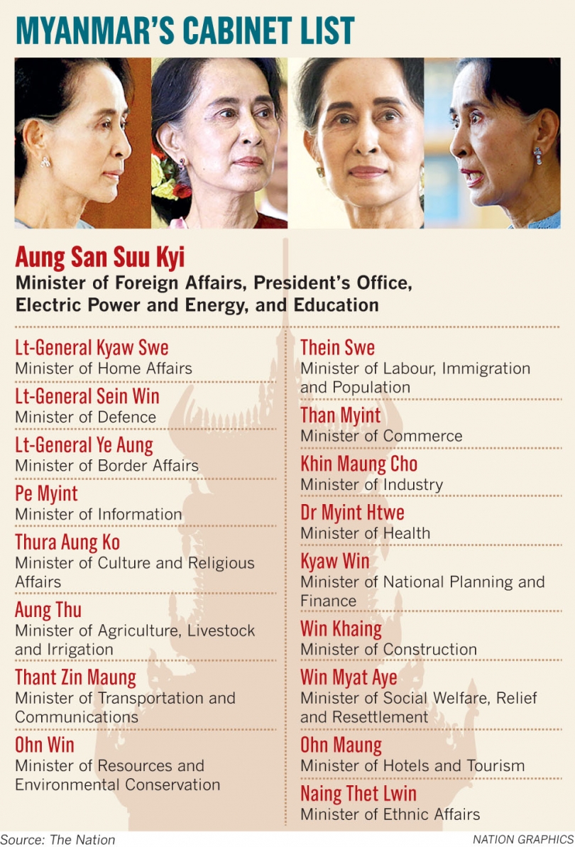 Suu Kyi, the only woman in the 21-member cabinet, was given four portfolios – Foreign Affairs, the President’s Office, Electric Power and Energy, and Education.