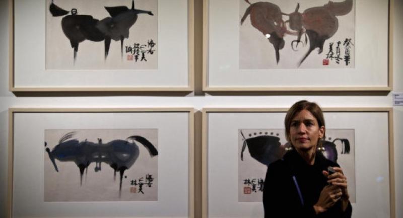 A woman sits beside a piece of artwork of Han Meilin during the exhibition in Venice, Italy on Oct 27, 2016. The exhibition "The World of Han Meilin" kicked off in Venice on Thursday and will last till Feb 28, 2017. As a global tour exhibition, it will also be held in Paris and Beijing.[Photo/Xinhua]