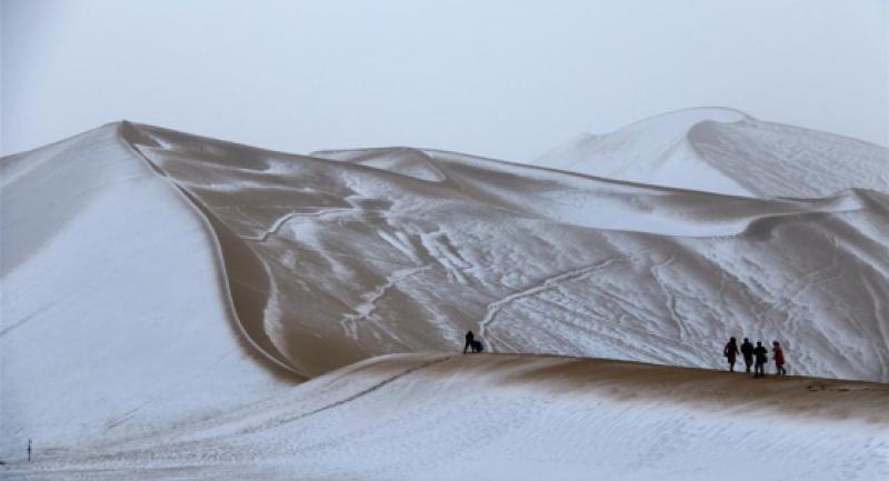 China Daily has compiled a photo gallery of scenes of first snowfall at the Crescent Lake in the Mingsha Mountain of Dunhuang city, Northwest China's Gansu province