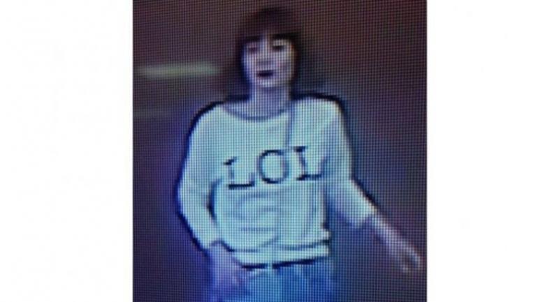 In the grainy image, she can be seen wearing a top with the word "LOL" in large letters and a blue short skirt, with her right hand over a small sling handbag.