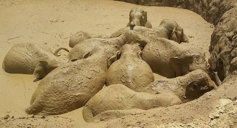 The elephants were discovered in the crater on Friday, said Keo Sopheak, with only their rounded backs and heads poking out of the mud pool.