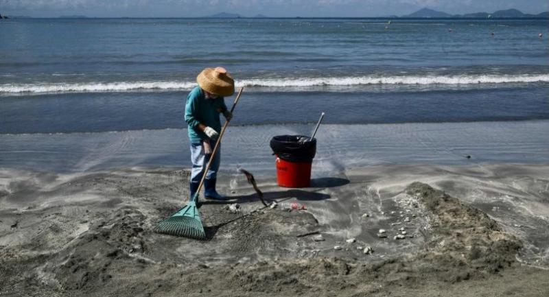 On Pui O beach, on the island of Lantau, cleaners raked through the famous black sand Monday morning retrieving lumps of palm oil mixed with other trash, from plastic water bottles to children's toys.