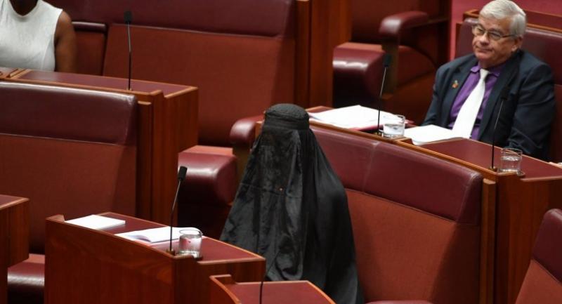 Hanson wore the Islamic garment in the chamber to highlight what she said were the security issues it posed, linking it to terrorism as fellow senators heckled her.