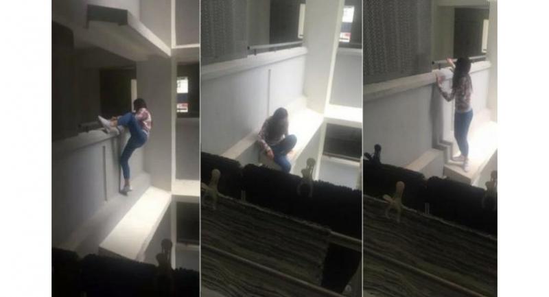 A neighbour spotted the girl on a ledge at the third-floor corridor, and took a video of it, Lianhe Wanbao reported on Monday.
