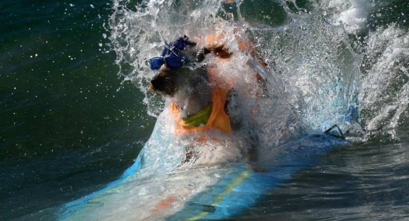 Surf dog Skyler competes in the tandem event during the 8th annual Surf City Surf Dog event at Huntington Beach, California on September 23, 2017. // AFP PHOTO