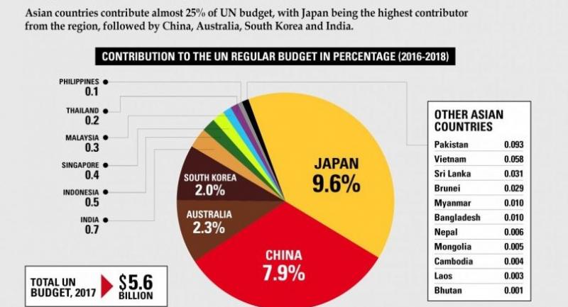 Pakistan, Sri Lanka, Nepal, Bangladesh and Bhutan together contribute less than 1 per cent to the UN budget with Bhutan being the least contributor in Asia. Myanmar, Vietnam, Cambodia and Loas together contribute 0.075 per cent to the annual UN budget.