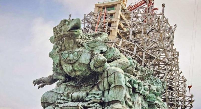The statue is made of copper and brass sheeting, with a stainless steel frame and skeleton, as well as a steel and concrete core column. The outer covering alone measures 22,000 square m in size. It was constructed in Nuarta’s workshop in Sarijadi, Bandung, West Java, before being chopped into more than 700 modules and transported to the construction site in Ungasan, Badung regency.