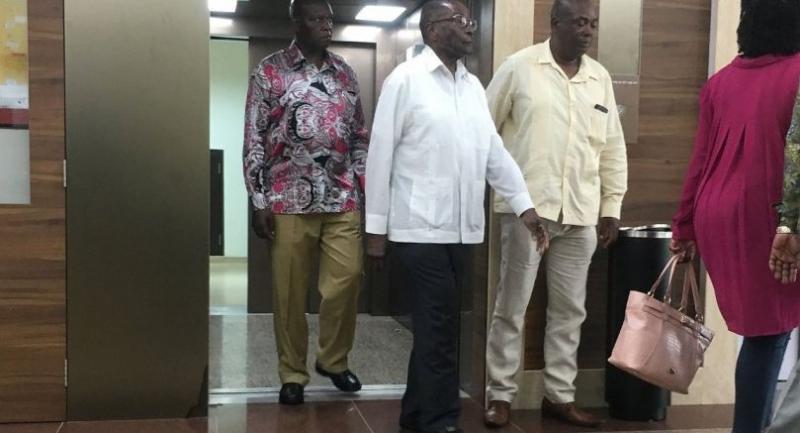 He walked quickly out of the building before he and his party were driven off in two cars.