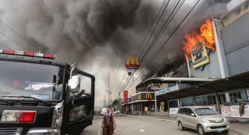 The blaze started at the four-storey NCCC Mall on Saturday morning sending thick plumes of black smoke billowing into the sky over Davao.