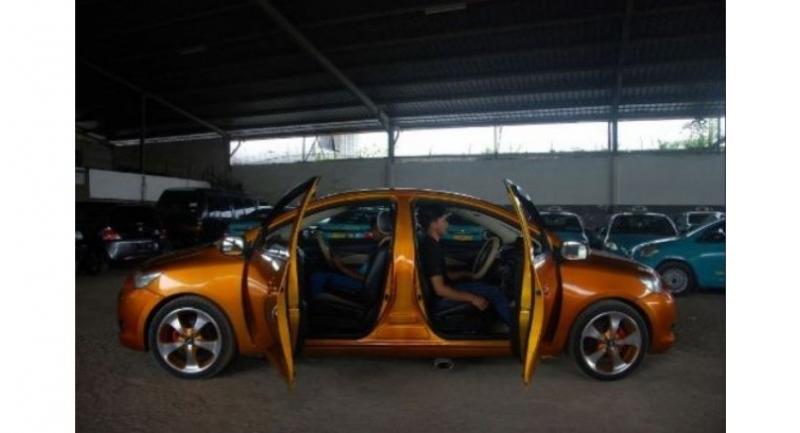 Roni Gunawan built the "two-faced" car with the help of colleagues in Bandung, West Java province, by welding together the front halves of two orange Toyota Limos.