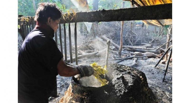 “First of all, you tie a bunch of leaves into small bundles and dry them under the sun, then dip the bundles into burning rubber.