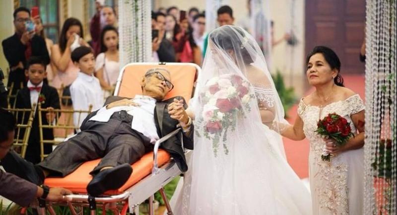 The bride, Charlotte Gay Villarin, has her fingers laced around those of her father who, despite being weak, looks lovingly at his daughter from a stretcher, which is being pulled down the aisle. On the bride’s left side is her mother.