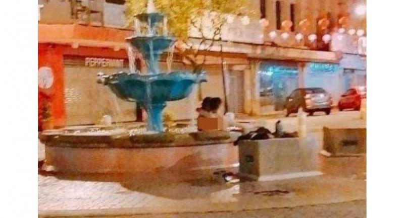 The couple, believed to be tourists, were seen topless and hugging each other in a fountain in a roundabout along the street in the central business district.