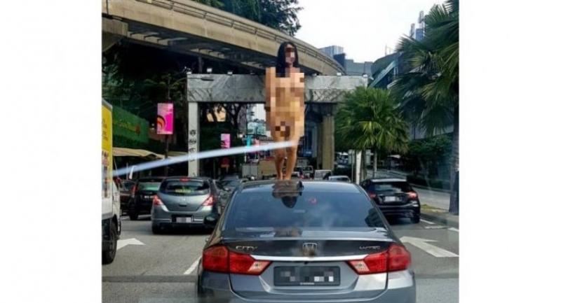 The person, who is believed to be a Filipino in her 30s, was seen parading herself stark naked on the street. At one point, she climbs onto the roof of a car stuck in traffic and gestures lewdly.