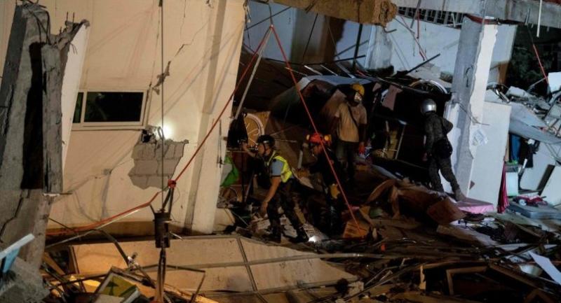 Scores of rescuers in the town of Porac were using cranes and jackhammers to peel back the pancaked concrete structure of a four-storey market building where the Red Cross said 24 people were unaccounted for.