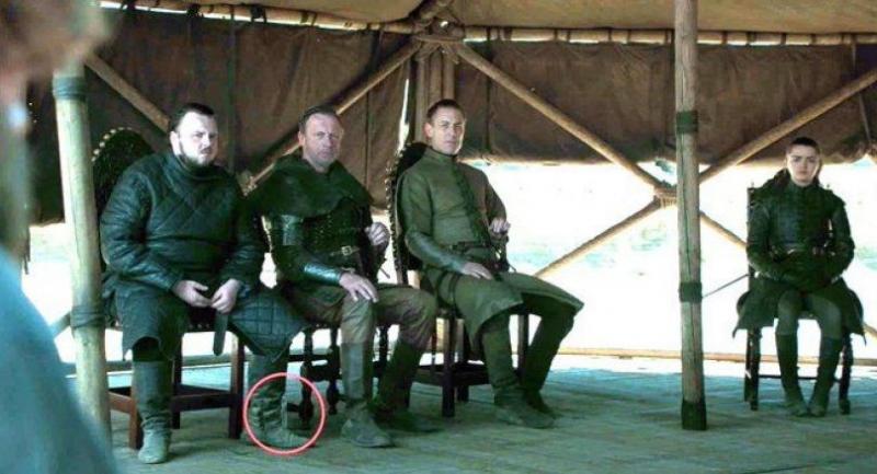 During a meeting among Westeros leaders, a plastic bottle is seen beside Samwell Tarly’s (John Bradley) leg.