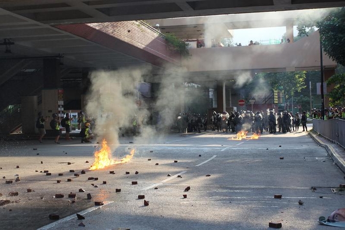 HONG KONG - Radical protesters, many dressed in black, blocked roads, set fires, threw gasoline bombs and vandalized public facilities in Tuen Mun on the west side of Hong Kong on Saturday.