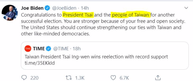 “Congratulations to President Tsai and the people of Taiwan for another successful election,” wrote Biden, saying: “You are stronger because of your free and open society.”