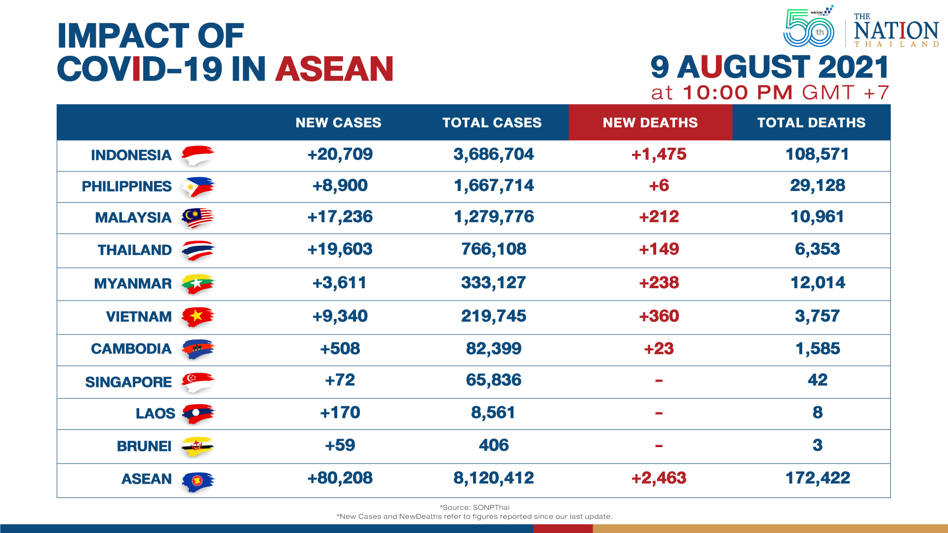 Asean countries reported 80,208 new cases on Monday, lower than Sunday’s 88,376, while deaths were 2,463, lower than the previous day’s 2,940.
