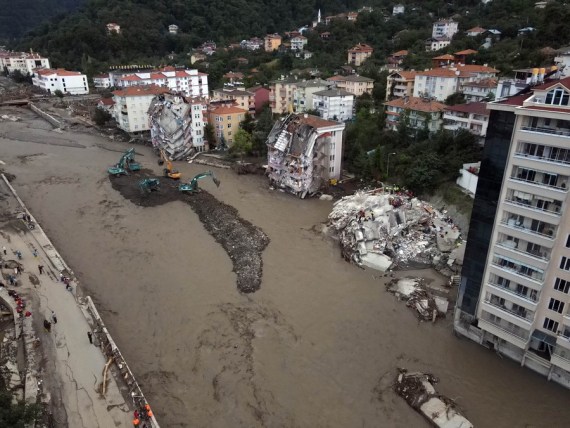 Rescuers work at a residential area affected by floods in Bozkurt district of Kastamonu province, Turkey, on Aug. 12, 2021.