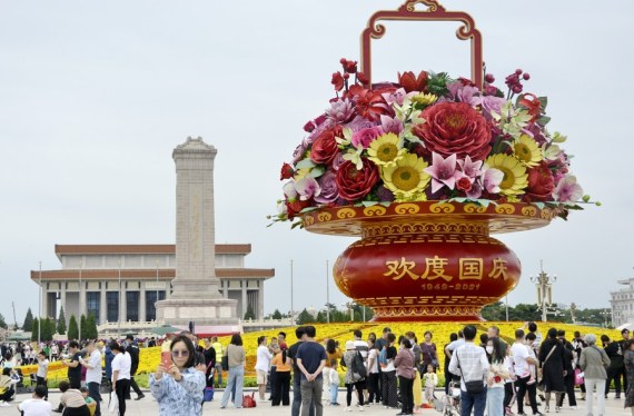 An installation in the shape of a flower basket measuring 18 meters in height and with a base diameter of 45 meters has been erected at the center of Tian'anmen Square as the highlight of this year's display, creating a festive atmosphere.