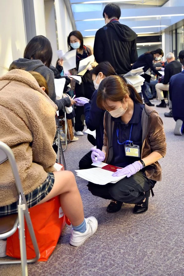 At Narita International Airport, quarantine officers are confirming whether incoming passengers had stayed in any of the designated countries by checking their written pledges of the places they visited in the past two weeks and their physical condition.