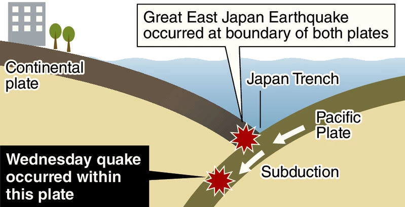 Measuring a maximum of upper 6 on the Japanese seismic intensity scale, the quake was a different type from the Great East Japan Earthquake, which occurred at the boundary of the oceanic Pacific Plate and a continental plate. The Pacific Plate subducts under a continental plate.