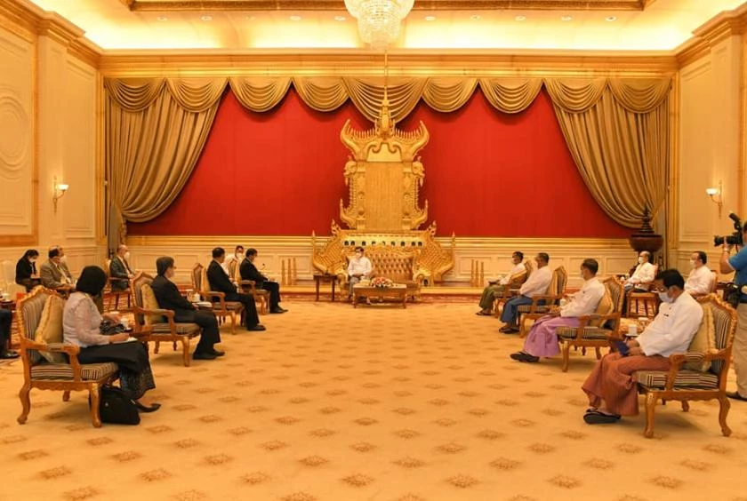 Also present at the meeting together with the Senior General were SAC Joint Secretary Lt-Gen Ye Win Oo, Union Ministers U Wunna Maung Lwin and U Ko Ko Hlaing, deputy ministers and officials. The Special Envoy was accompanied by Minister of Industry, Science, Technology and Innovation H.E. Kitti Setta Pandita Cham Prasidh, ASEAN Secretary General H.E. Dato Lim Jock Hoi, deputy ministers, Cambodian Ambassador to Myanmar H.E. Mr. Chhouk Bunna and officials, it said.