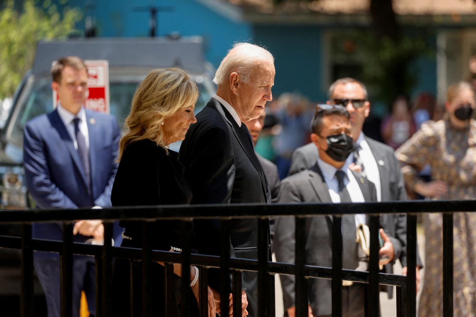 The president and first lady Jill Biden wiped away tears as they visited memorials at the Robb Elementary School where the gunman killed 19 students and two teachers, laying white roses and paying respects to makeshift shrines to the victims.