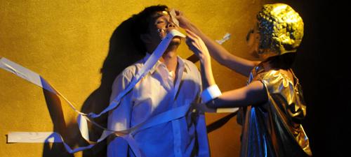 A man in normal office worker attire runs throughout almost the whole performance. He ignores a woman in a skimpy black dress, while succumbing to the other two men, whose bodies are completely painted in gold and who dictate his actions all along. When he has the opportunity to make a choice, he chooses the gold.