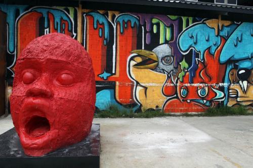 The site is a three-rai park with a large two-storey structure that was colourful enough to begin with without all the funky graffiti. Inside there’s a big kiln, outside a showcase for sculptures.