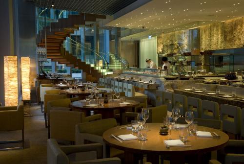The two-floor restaurant, capped with a bar area, has big tables for families (and triads) and smaller ones in the corners for couples. The bar serves full meals as well if you enjoy DJ accompaniment, but the main dining area downstairs is also fun with its open kitchen and various food stations manned by chefs.