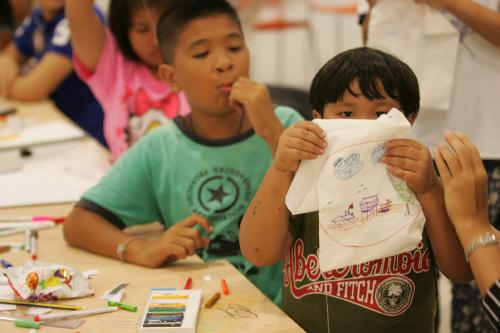 Rajamangala Stadium has housed more than 1,000 flood victims for nearly a month. At least 30 kids enjoy getting creative with paper with the volunteer artists and designers of a group called Art for Help.
